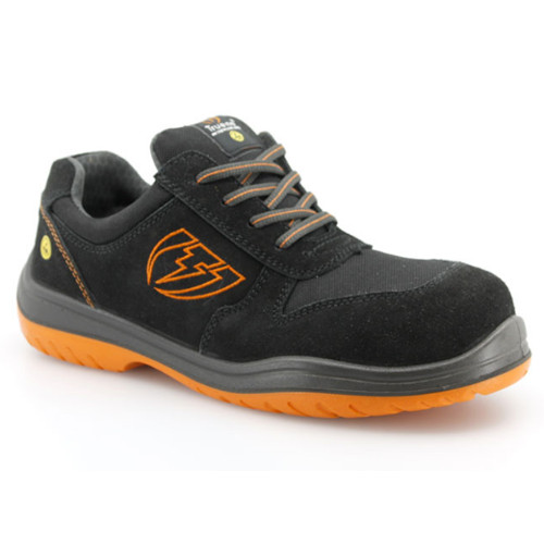 Calzado de seguridad S3, de piel serraje color negro. Zona del collar acolchada. Exento de partes metálicas Con puntera interna de horma ancha realizada en composite resistente a un impacto de 200 J de energía y a una compresión de 15 kN. Suela de poliuretano (PU) expandido inyectado directamente en el corte (sin cosidos ni pegados) de color negro. Patín de Poliuretano (PU) de alta densidad inyectado directamente (sin cosidos ni pegados) de gran resistencia mecánica en color naranja. Absorción de energía en la zona del tacón. Resistente a hidrocarburos.Tratamiento antihidrólisis, que evita la degradación química del poliuretano causada por la humedad, el calor y el paso del tiempo. Plantilla antiperforación textil tipo “PS”